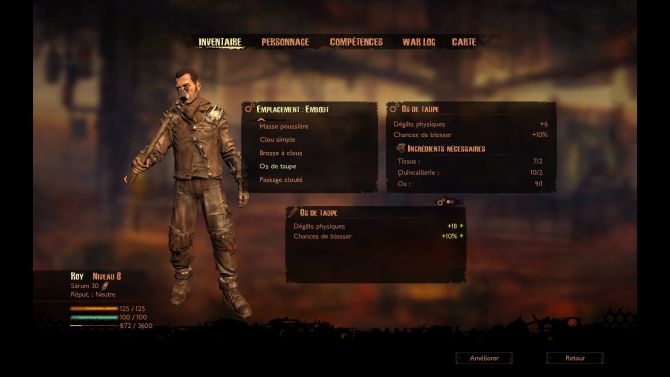 Dernier point RPG, le matos. Côté arme, vous avez votre gourdin de combat, aux effets variables selon la manière dont vous le trafiquez (blessures, critiques, étourdissement, etc). Même un vieux général de guilde se bat avec un pauvre tuyau en fer, c'est un peu ridicule. Un peu plus de diversité n'aurait pas fait de mal. On trouve aussi différentes armures que l'on customise d'après son style de jeu : plutôt bourrin ou technomant. Upgrader son équipement est vital, c'est pourquoi je me demande qui ira acheter des pièces qui ne disposent pas d'emplacements spéciaux. Encore un détail qui sonne un peu inutile... Tout comme le fait de valider une fenêtre de butin à chaque corps ou conteneur fouillé. Il n'y a pas de limite de poids porté, on prend tout, alors pourquoi devoir cliquer à chaque fois ? Le recyclage est aussi important pour créer des consommables (soins, munitions, explosifs), vous passerez donc un certain temps à faire de la récup' et à nettoyer les zones encore plus méticuleusement qu'un Booker DeWitt sous coke. Un poil trop pour que ça soit vraiment confortable au final, surtout qu'il n'y a jamais de surprises à découvrir.