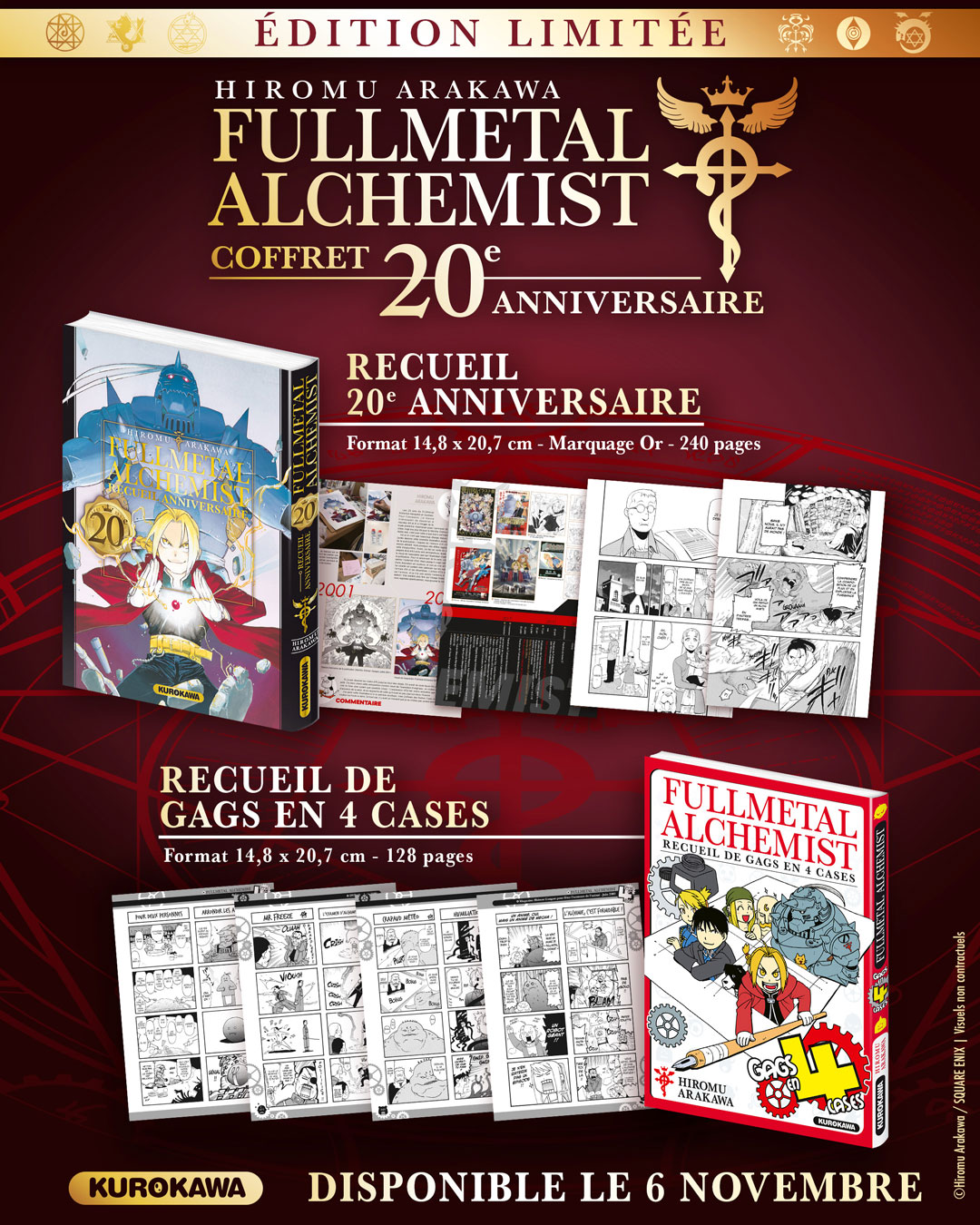 Vingt ans déjà que Fullmetal Alchemist a marqué toute une génération de lecteurs. Pour célébrer cet anniversaire symbolique, l’éditeur Kurokawa annonce un superbe coffret commémoratif regroupant plusieurs ouvrages inédits et objets exclusifs. Un véritable hommage à l’univers culte imaginé par Hiromu Arakawa, disponible dès le 6 novembre 2025.