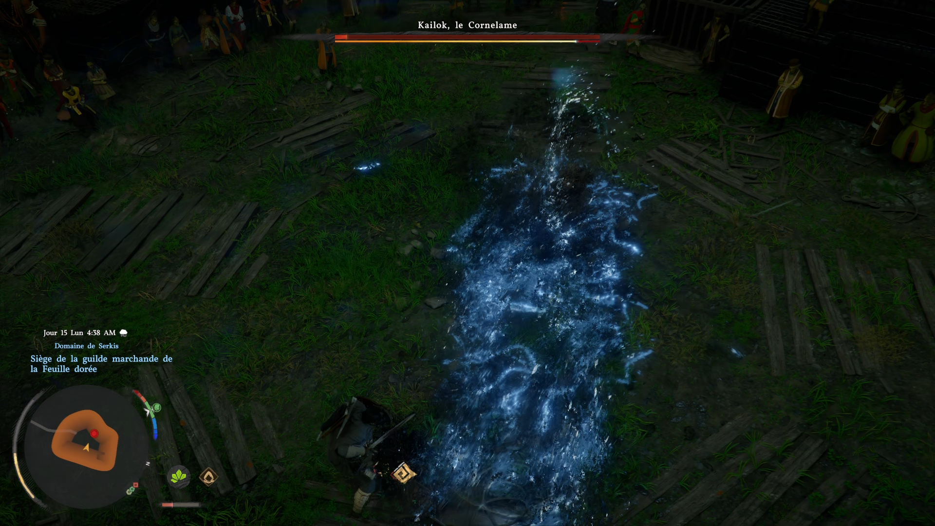 Lorsqu'il fait ses ondes de choc, ne cherchez pas à l'interrompre. Il attaquera normalement trois fois et lors de la plus grande vague d'énergie projetée, vous pourrez alors lui rentrer dedans pour contre-attaquer. Ce n'est peut-être pas le boss le plus puissant de Crimson Desert, mais Kailok, le Cornelame a également une botte secrète. Lorsque l'écran devient sombre et qu'il embrase son arme, faites très attention. Kailok propulsera plusieurs fois des ondes de choc avant de terminer par une puissante attaque composée de plusieurs vagues très rapides capables de vous tuer sur place. Esquivez impérativement cette dernière salve. Vous pourrez prévenir l'attaque puisque Kailok fera une animation spéciale en brandissant son arme juste avant son ultime.