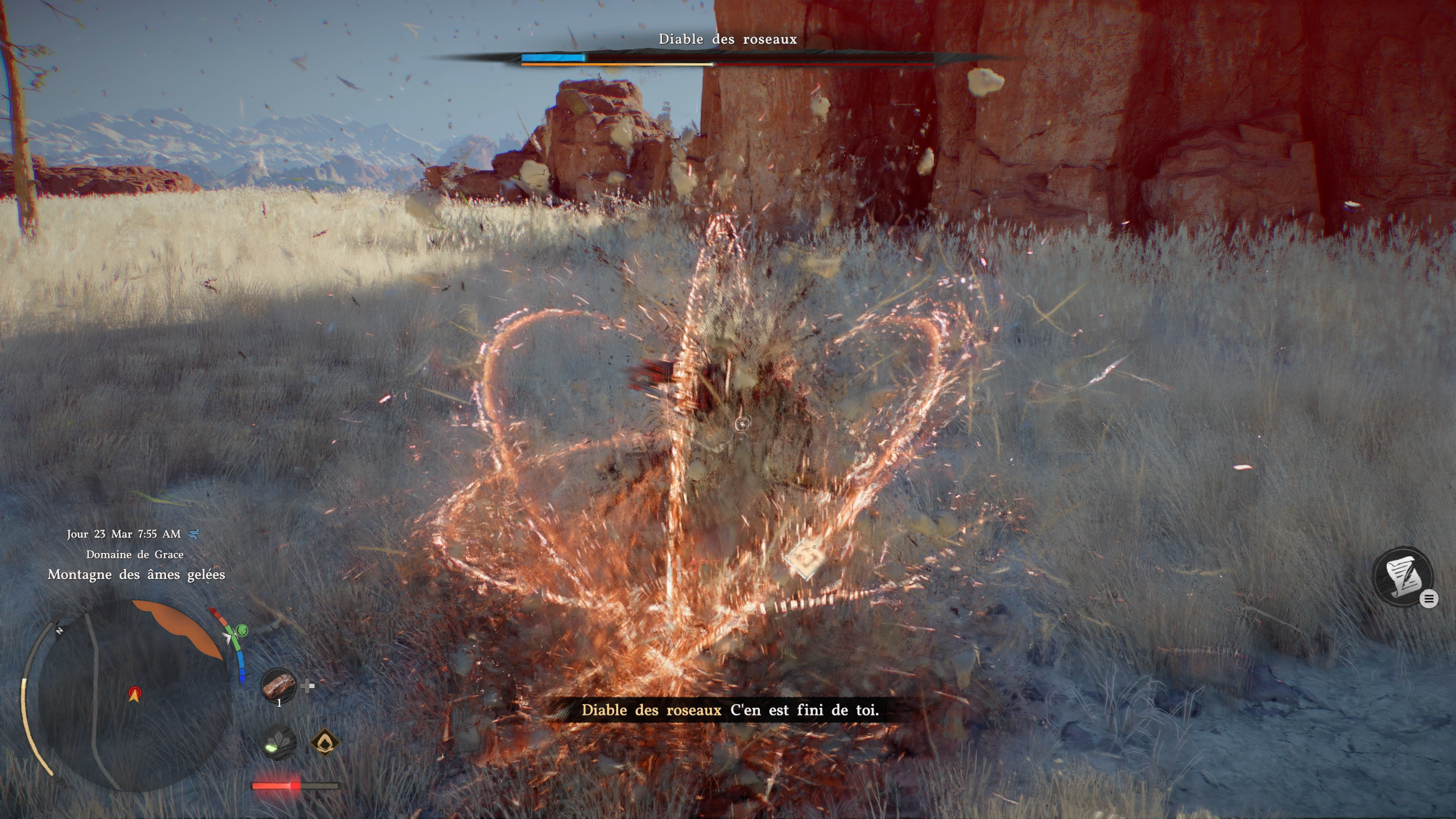 Note très importante, si vous mourez durant cette phase et que vous voulez utiliser un Comprimé de Palme, spammez bien le bouton d'esquive afin de faire une ruée dès que vous remettez un pied à terre. Sans ça, vous mourrez une nouvelle fois immédiatement puisque le Diable commencera son attaque pendant l'animation de résurrection, période où vous ne pouvez pas bouger du tout. C'est l'un des problème de Crimson Desert qui, on l'espère, finira par être réglé.