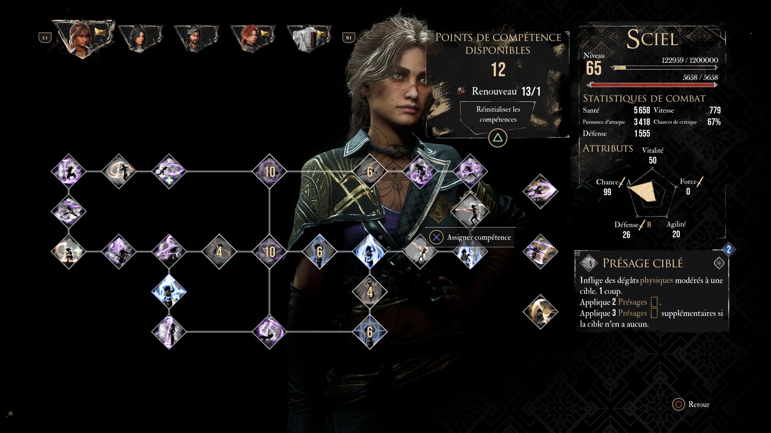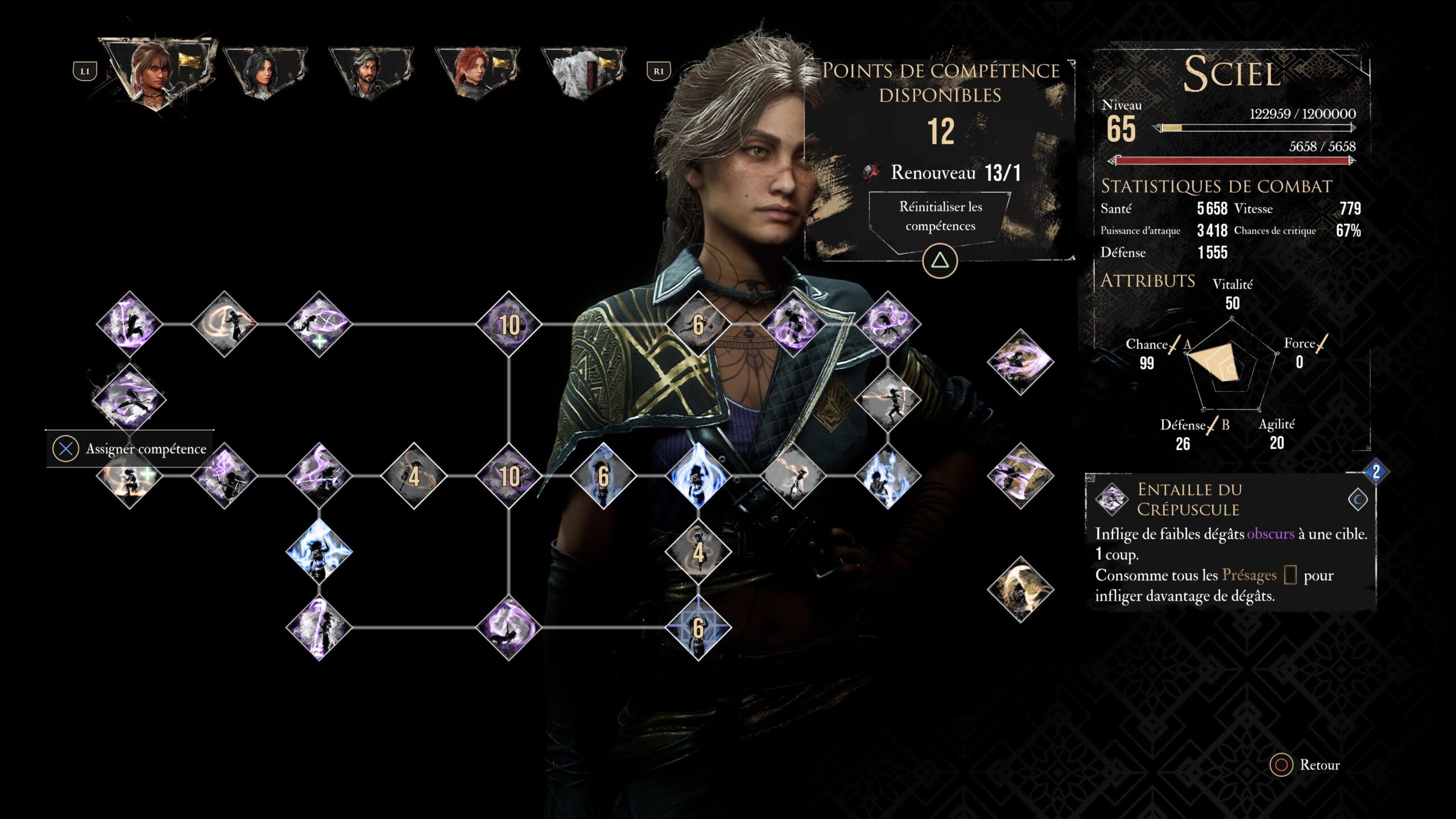 Équipez-vous aussi d’une compétence de type Lune qui consomme tous les Présages comme Récolte ou encore Entaille du Crépuscule, mais aussi une compétence qui ne consomme pas ou peu de Présages comme Ombre Volantes, ou encore Sombre Purification.