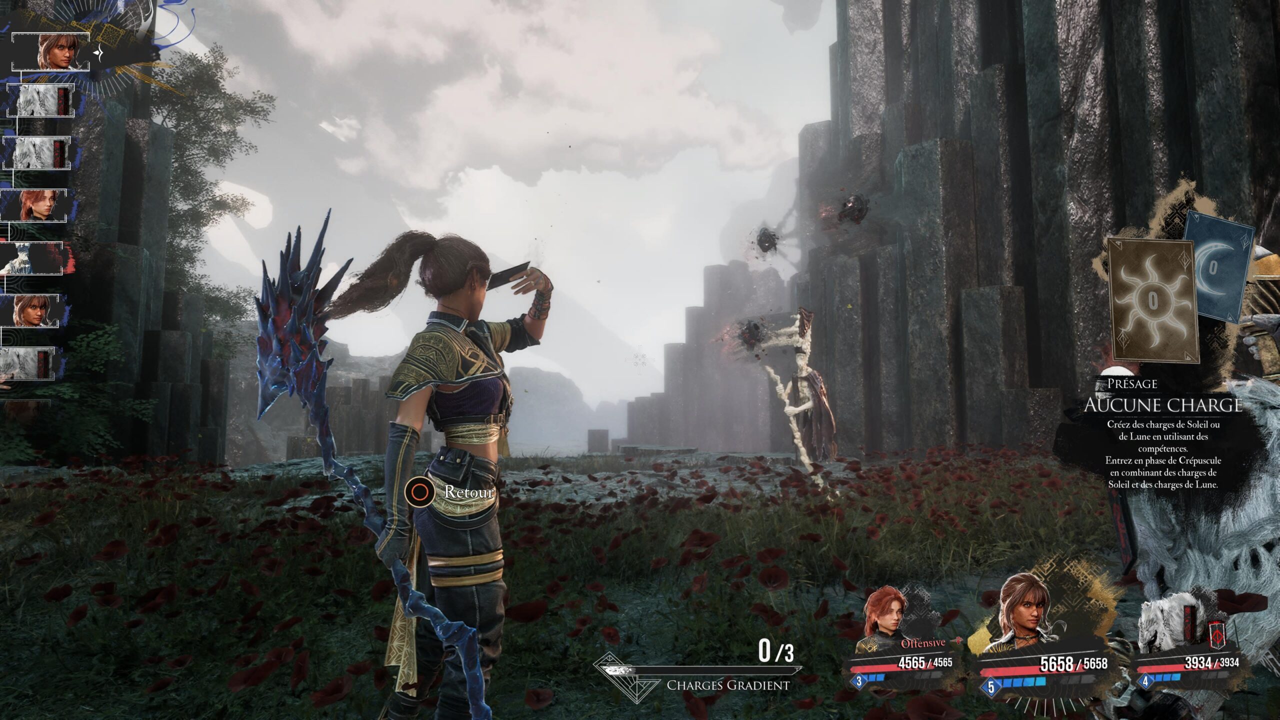 Astuce : Il est possible que vous ne réussissiez pas à stocker 20 présages lors du premier tour de Crépuscule, si c’est le cas pas de panique ! Il suffira de bourrer les compétences Soleil pendant toutes les phases de Crépuscule jusqu'à atteindre les 20 Présages sur la cible. Arrangez-vous ensuite pour revenir en phase Crépuscule sans consommer de Présage, et le tour est joué !