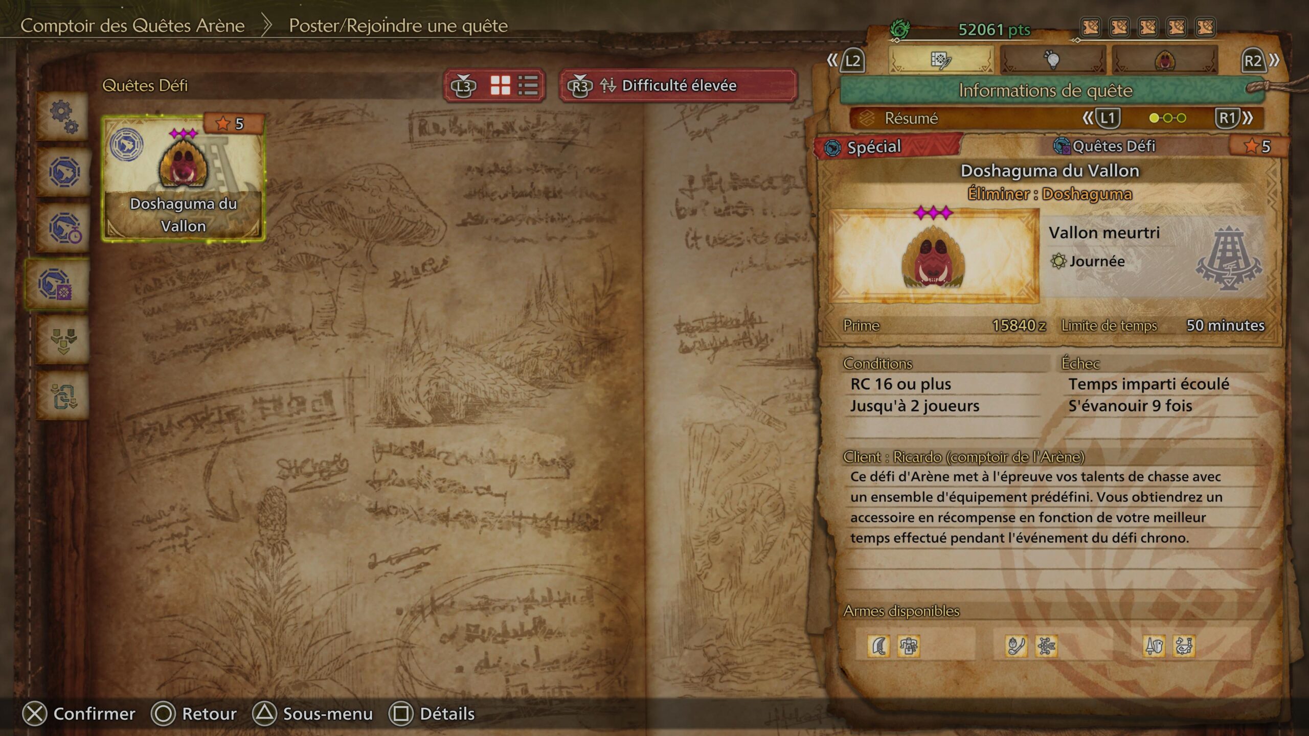 Pour cette nouvelle quête, la première de son genre, vous devrez combattre un Doshaguma dans le Vallon Meurtrie. Comme pour les quêtes d’arène, les Défis sont à réaliser en s’équipant d’armes prédéfinies proposées par la mission. L’objectif est ensuite de se défaire de la créature le plus vite possible pour gagner des places dans le classement, mais aussi des récompenses spéciales. À vous de voir ce qu’il vous convient le mieux et de tester différentes stratégies.