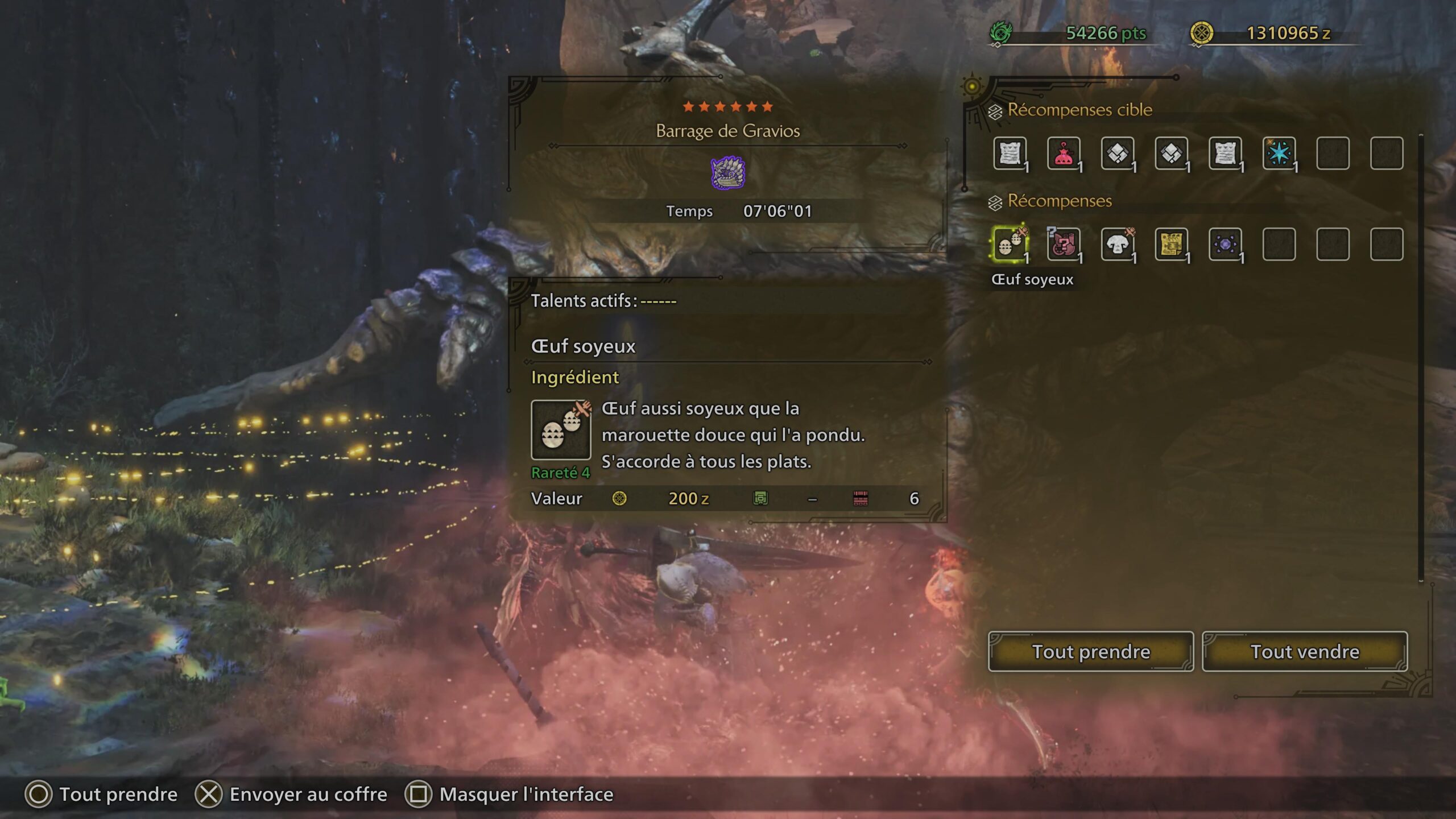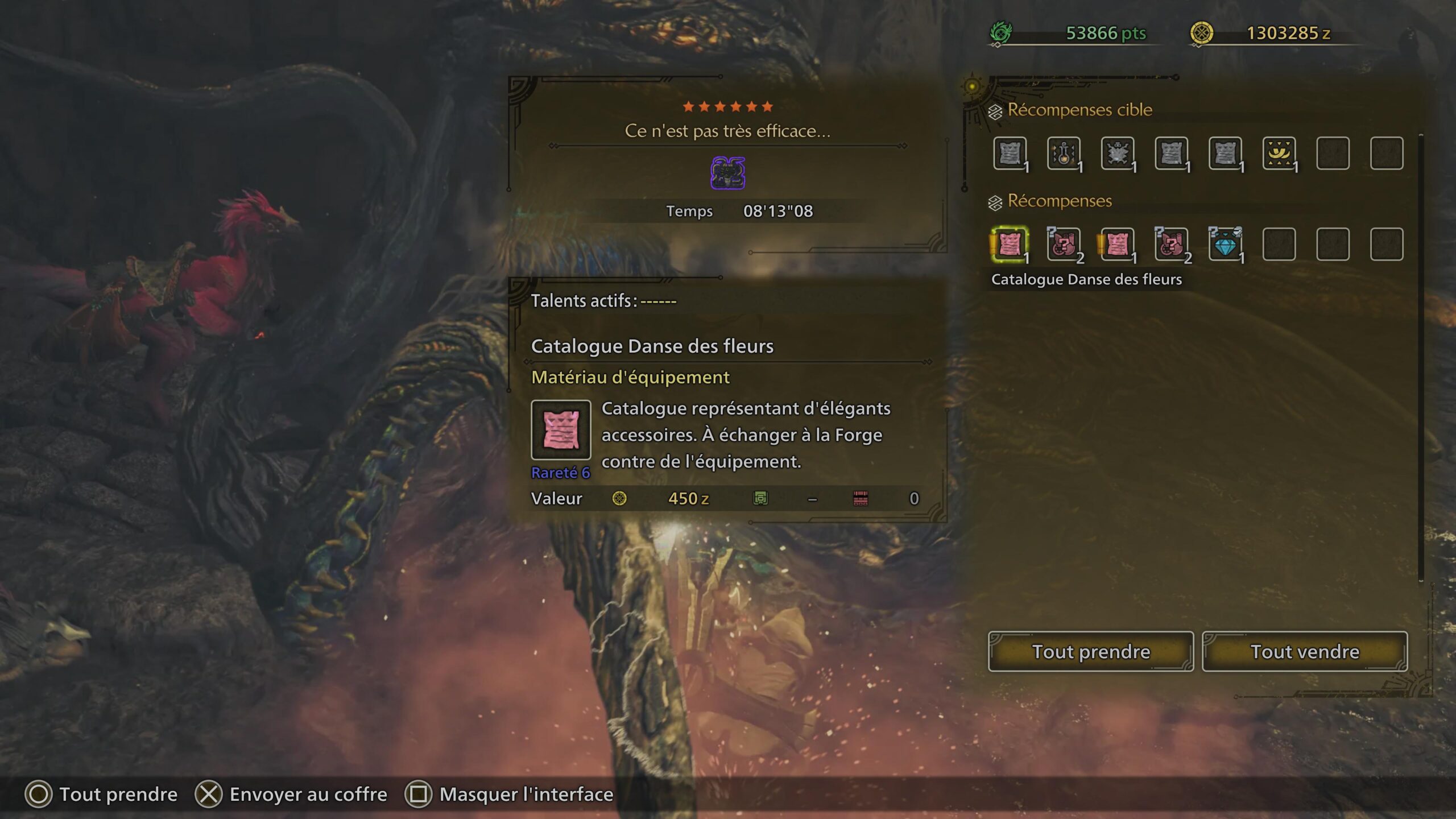 - Tasette : Ticket Floraison x1, Dard Lala Barina+ x2, Grand papillon à corne x3, Bouillon de monstre x1