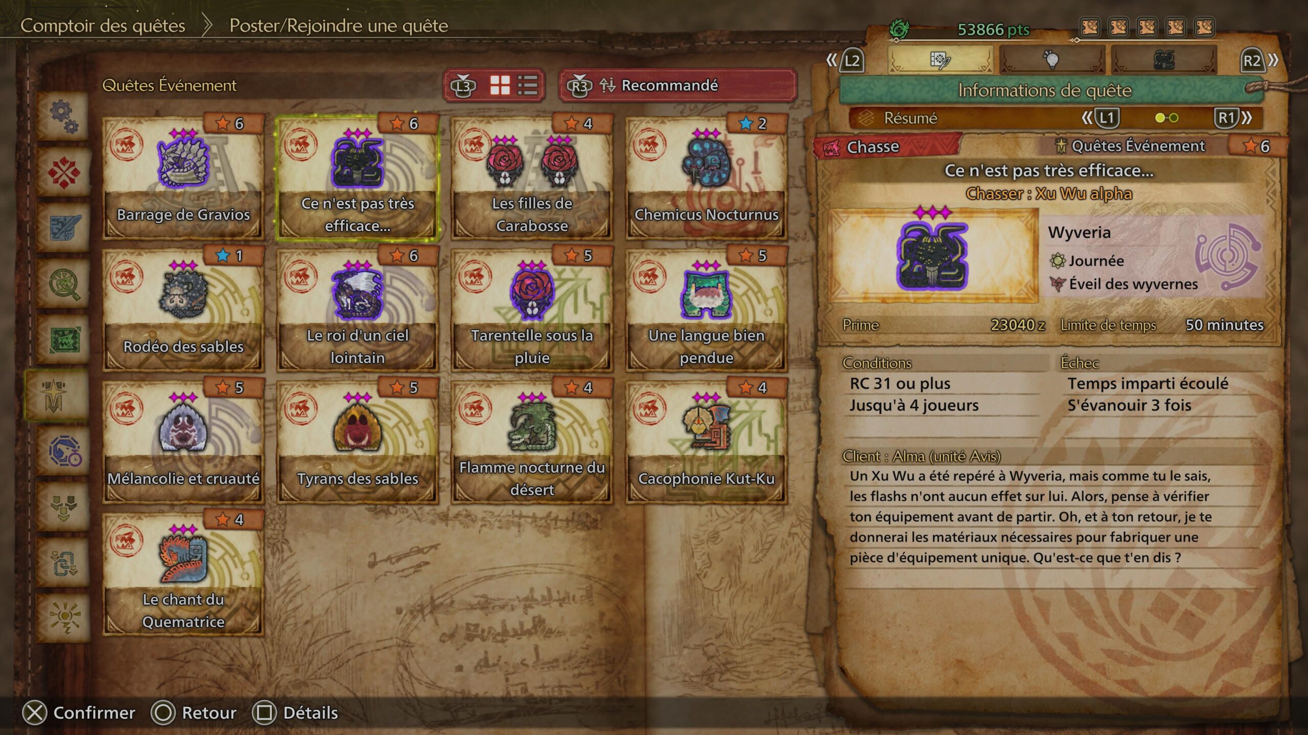 Au menu de ces nouvelles missions de chasse donc, des grands monstres alpha, un peu de challenge, mais aussi des chasses pour les débutants et les nouveaux joueurs de Monster Hunter Wilds. Pour leur lancement, ces quêtes sont disponibles du 23 avril au 7 mai 2025. Passé ce délai, il faudra patienter jusqu’à leur réapparition. Pas de date pour le moment, la cadence à laquelle Capcom compte effectuer ses rotations de missions n’est pas encore connue à l’heure où ces lignes sont écrites. En plus de toutes ces nouvelles quêtes, d'anciennes chasses sont disponibles et peuvent être faites à volonté. On vous le conseille d'ailleurs.