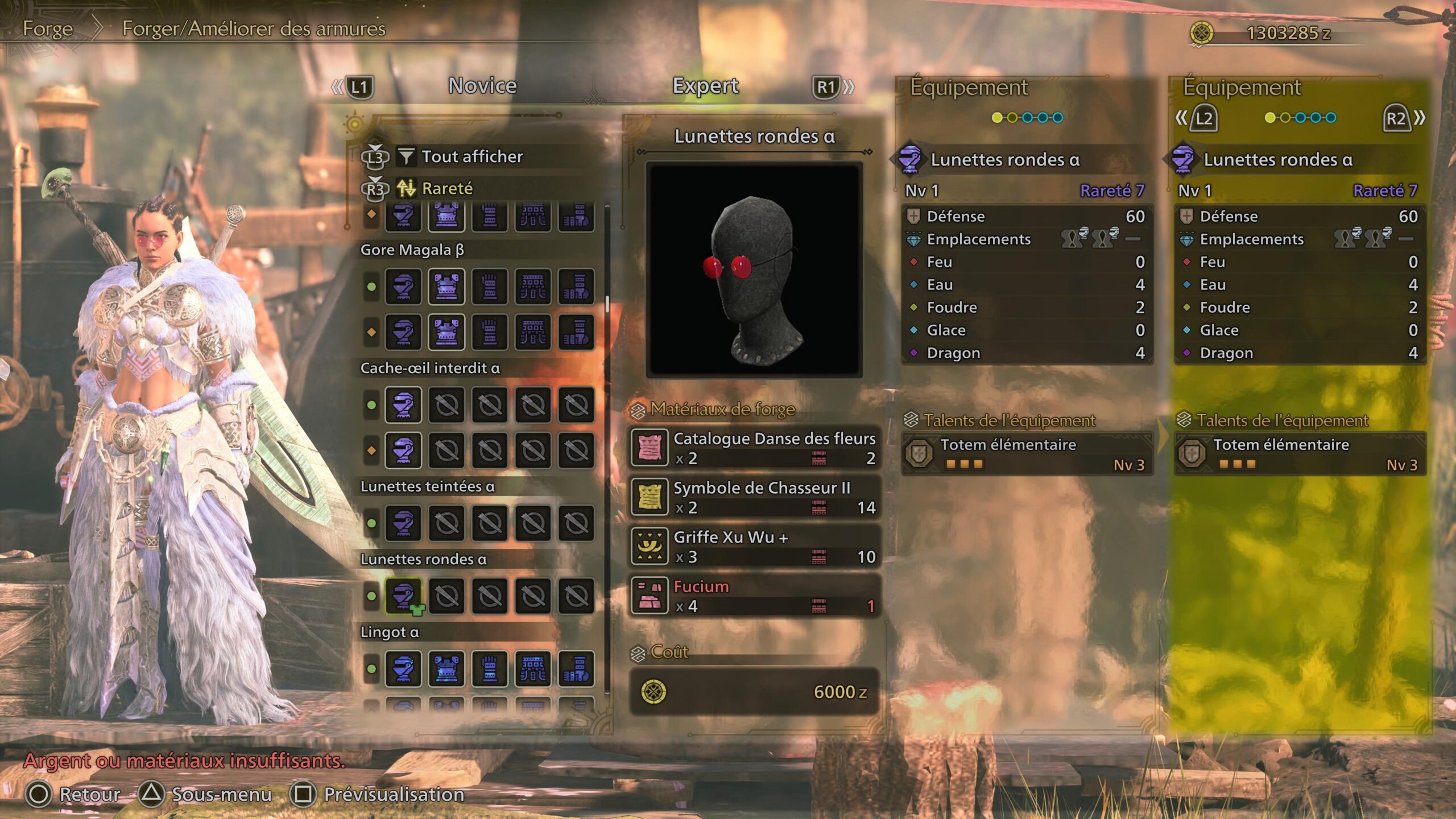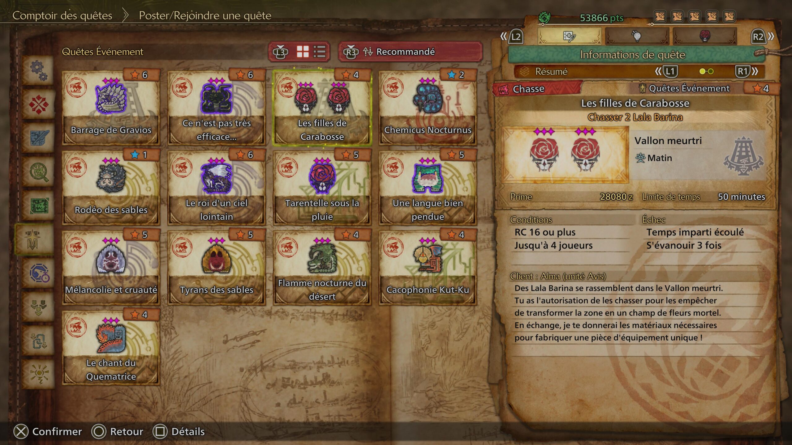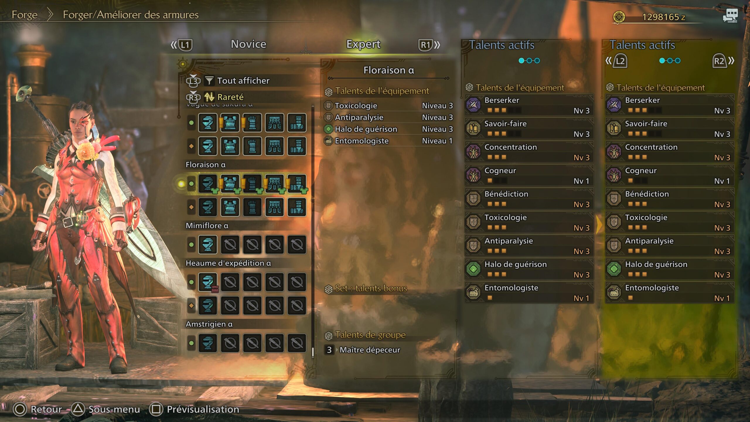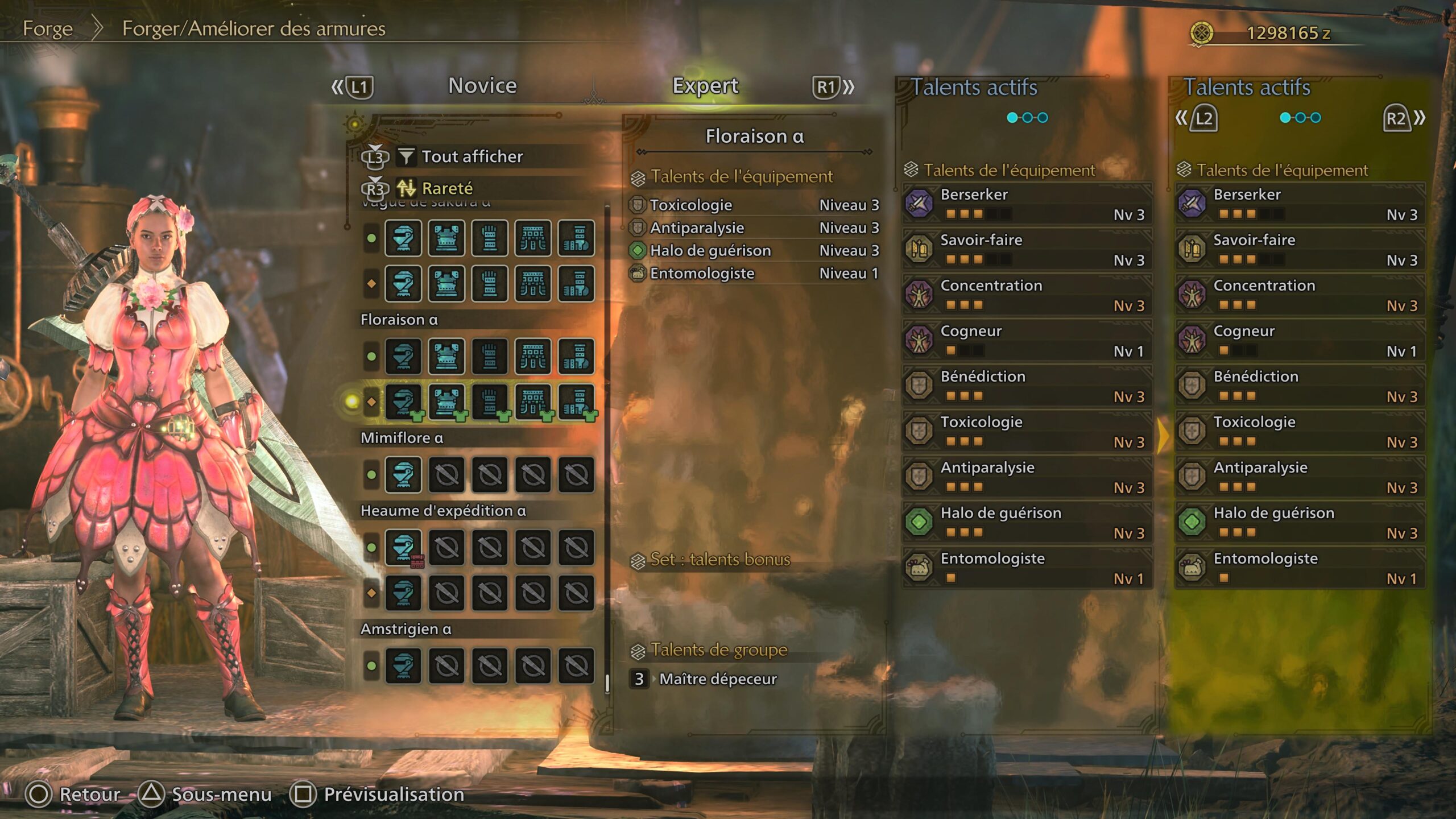 - Jambe : Ticket Floraison x1, Fleuron Lala Barina+ x3, Cuirasse Comaqchi x4, Bouillon de monstre x1