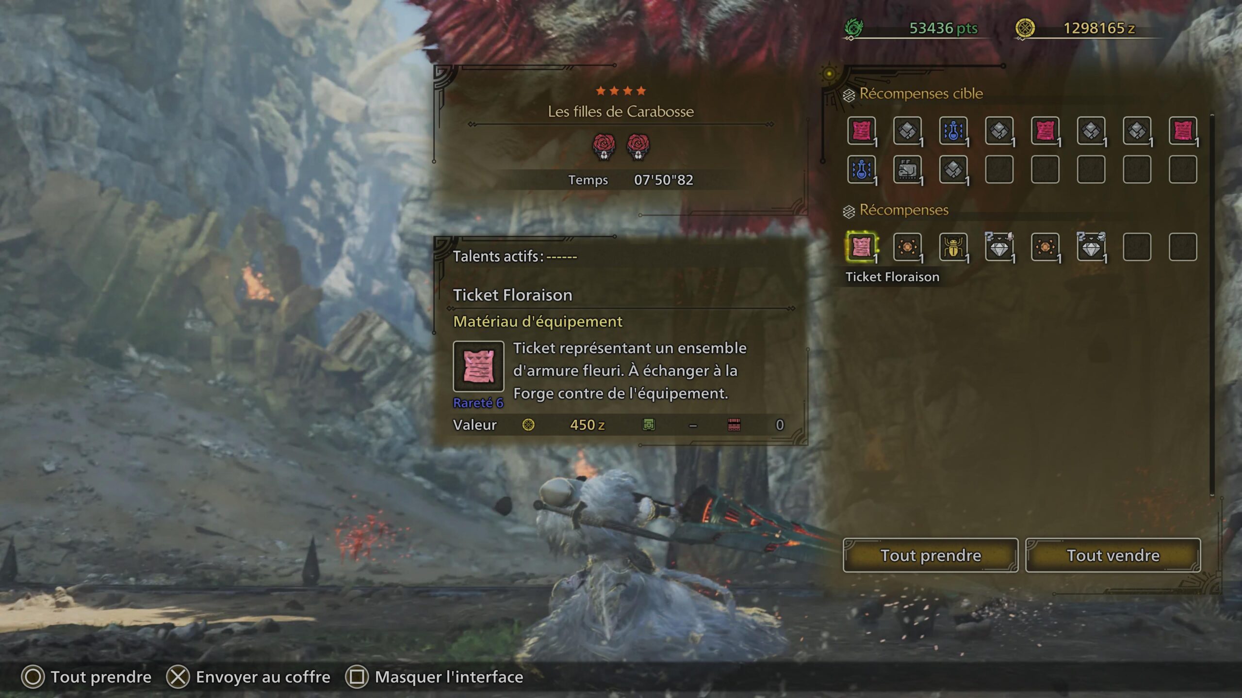 - Récompense : Ticket Floraison, pour fabriquer l'armure Floraison