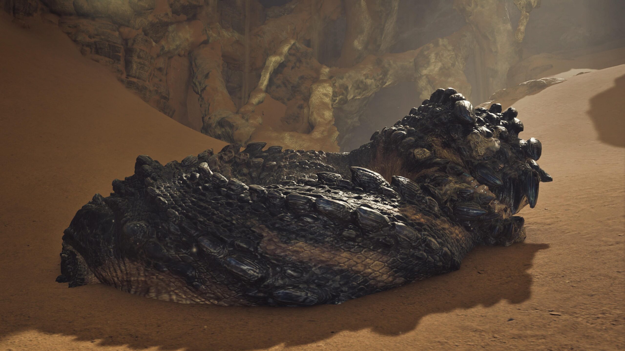 Comme le Chatacabra, le Balahara est l’un des premiers grands monstres que l’on aura à affronter. Ce « ver des sables » est d’ailleurs la première créature que l’on rencontre dans cette nouvelle partie du monde inexplorée. Il ne représente donc pas de réelle menace d’autant que là encore c’est une mission taillée pour les nouveaux joueurs de Monster Hunter Wilds. Prenez juste des capsules sonores sur vous pour le faire sortir du sable lorsqu’il s’enterre, et le tour est joué !