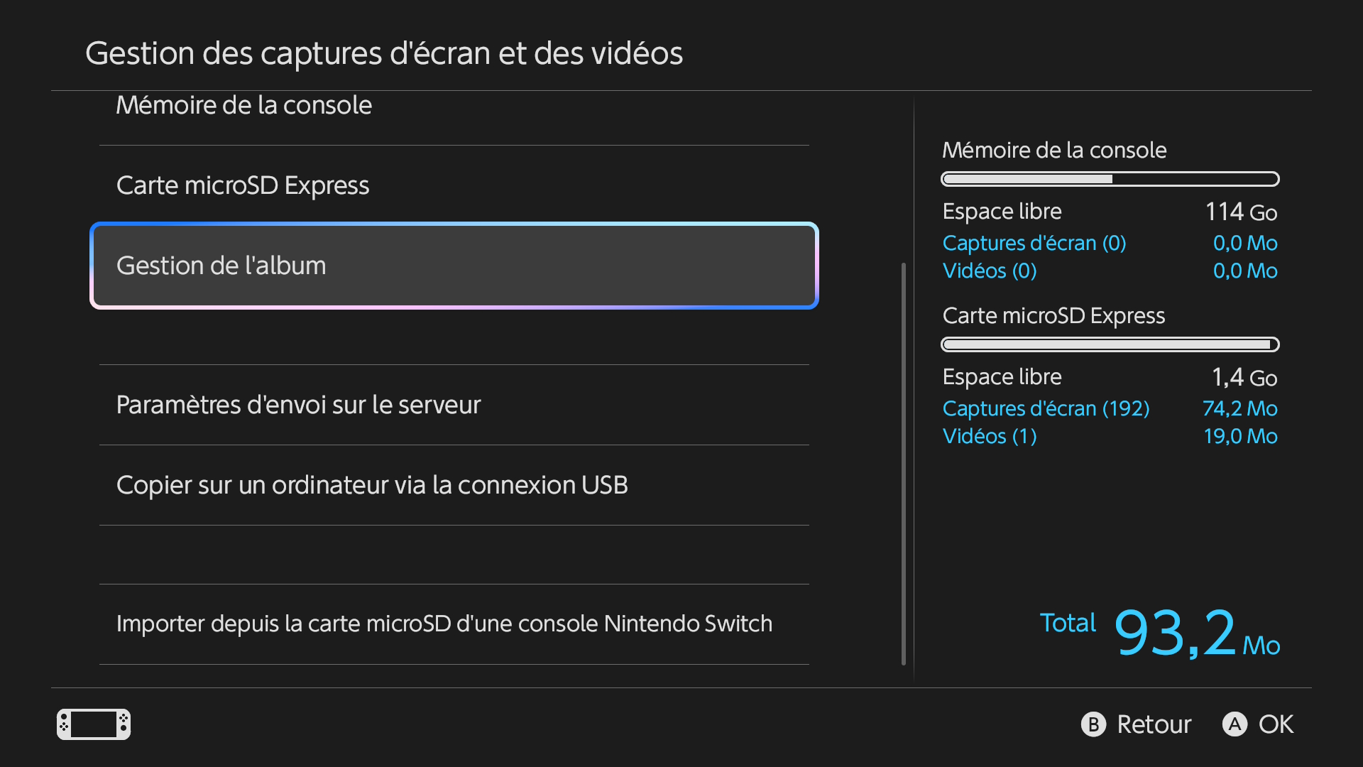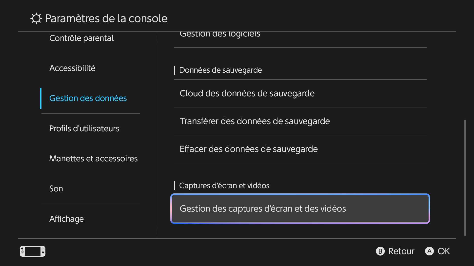 Dans ce menu, vous pourrez gérer toutes vos captures d’écran et autres vidéos de jeux. Il sera ainsi possible de changer le stockage par défaut de vos captures, de les transférer d’un espace à un autre ou encore de les transférer sur PC justement.