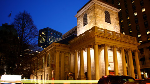 La King's Chapel (Chapelle du Roi) de Boston dans la réalité (passez votre souris sur l'image pour voir la version en jeu).