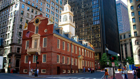 La "Old State House" (l'ancien capitole) de Boston dans la réalité (passez votre souris sur l'image pour voir la version en jeu).