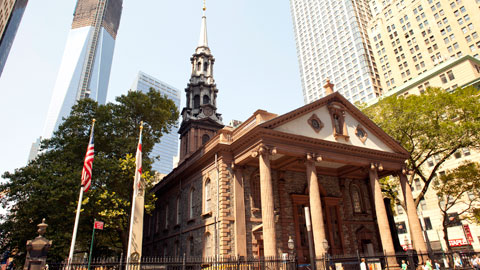 La La Chapelle de Saint Paul à New York dans la réalité (passez votre souris sur l'image pour voir la version en jeu).