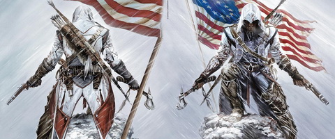 Retour sur notre nouvel ami. Bon, on va pas tourner autour du pot. Arc, flèches, tomahawk astucieusement forgé avec le A des Assassins, bracelets typiques autour du bras... c'est un indien, un "native american" comme on dit aujourd'hui là bas. Des éléments nouveaux, (promesses de nouvelles compétences ?) qui se fondent dans la panoplie classique de l'assassin : capuche blanche à pointe (cette fois à l'aigle brodé, un nouveau hoodie à acheter en perspective). Deux gants qui se prolongent sur les avant-bras, en cuir, sertis du A, support de la lame secrète... Voilà donc le premier Assassin Indien. Un visage indien qu'on découvre beaucoup plus typé dans la couverture de GameInformer. Un artwork qui nous donne d'autres éléments.