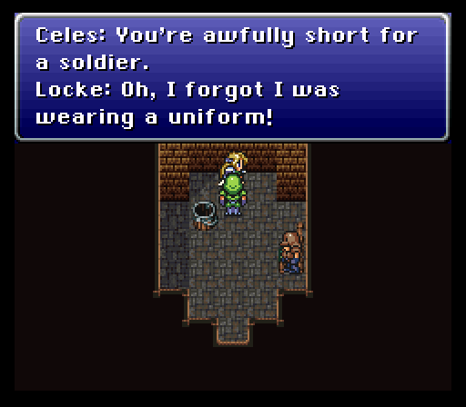 - Première d'entre elles : Celes qui dit à Locke (ça ressemble à Luke, non ?) qu'il est un peu petit pour un soldat, lui répondant qu'il a oublié qu'il portait un uniforme.