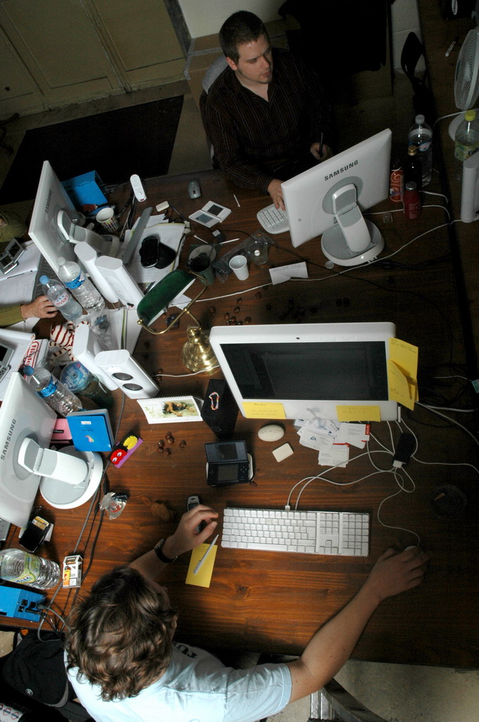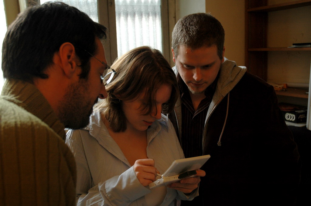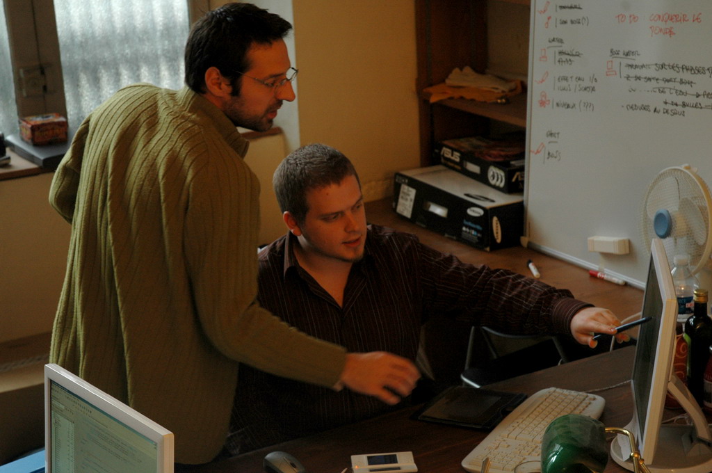 vant de décortiquer un peu le jeu, parlons de l'équipe. Elle se compose donc du chef des fous, Camille, 32 ans et loin d'en être à son coup d'essai. Il était déjà fondateur et PDG d'Infraworlds (devenu ensuite Filao), une société de JV pour téléphones portables. Un concurrent de Gameloft. Aux graphismes, on trouve un phobique de la photo, Aurélien (en position "tu vois, c'est là que les bactéries attaquent"), 26 ans seulement et déjà un petit côté Pascal Sevran "je veux être certain que je suis beau sur la tof, stou !". Vu le talent, on peut vanner et après respecter. Il est fort le bougre. Au code, le doyen de la "core team", Eric, 36 ans et tous ses neurones : c'est lui qui fait en sorte que la DS vous impressionne. Et ça marche. Surtout quand on voit le décor de fond s'animer en 3D (le tout avec deux polygones et demi). La musique ? Y'en a. Plein. Et de la bonne, merci au duo Yubaba Smith and Fortune. Derrière ce nom de code que je m'abstiendrais de qualifier, se cachent les deux énergumènes chargés des bruitages et musiques. Ils font ça avec une classe indéniable. Fan d'électro-pop, allez donc jetez une oreille sur leur site. Je sais, passé le truc minimaliste violet, c'est du MySpace moisi, mais tant pis. On peut écouter quelques prods, et c'est l'essentiel. "JustLikeaGhost"... Mmmm un morceau parfait pour écrire la nuit. Dernière recrue en date d'Arkedo, Maiwen, vient doubler (d'un coup d'un seul) la force de travail côté code et s'occupe de la partie multi. Si ça lag, ça sera de sa faute (pressiooooonnnn !)