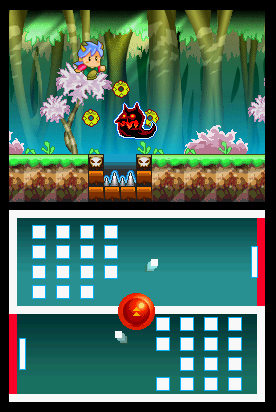 Exemple de niveau qui rend fou : 2 tableaux à gérer avec sur l'écran du haut un personnage qui devra éviter monstres et pièges en sautant. Et pour ça il faudra aussi penser à appuyer sur le gros bouton rouge. Fastoche ? On en reparle bientôt...