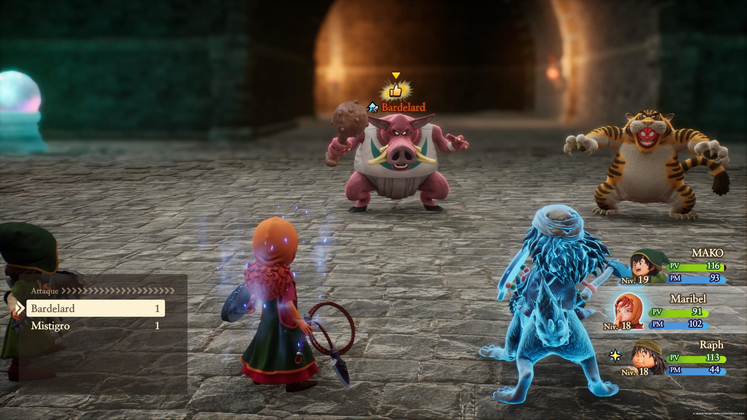 Cette petite trogne rondouillarde, rappelant des figurines en pâte à modeler posées dans des dioramas délicatement éclairés, donne une identité aussi forte que magnifique au jeu. Elle sied surtout à merveille à l’esprit de Dragon Quest et sa candeur, tout comme à la patte du regretté Akira Toriyama. On prend un plaisir non dissimulé à retrouver les monstres emblématiques de la licence avec une expressivité nouvelle, portée par des animations et des bruitages dignes d’un dessin animé du dimanche après-midi. Hors des arènes de combat, particulièrement réussies, certains environnements peuvent sembler un peu dépouillés, mais ils sont systématiquement contrebalancés par une cinématique ou des jeux de couleur bien sentis.