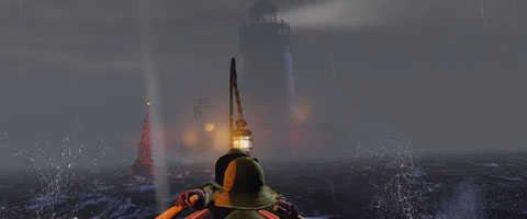 Les toutes premières secondes de la séquence d'ouverture du jeu, en pleine mer, avec un phare planté au milieu des flots à l'horizon.