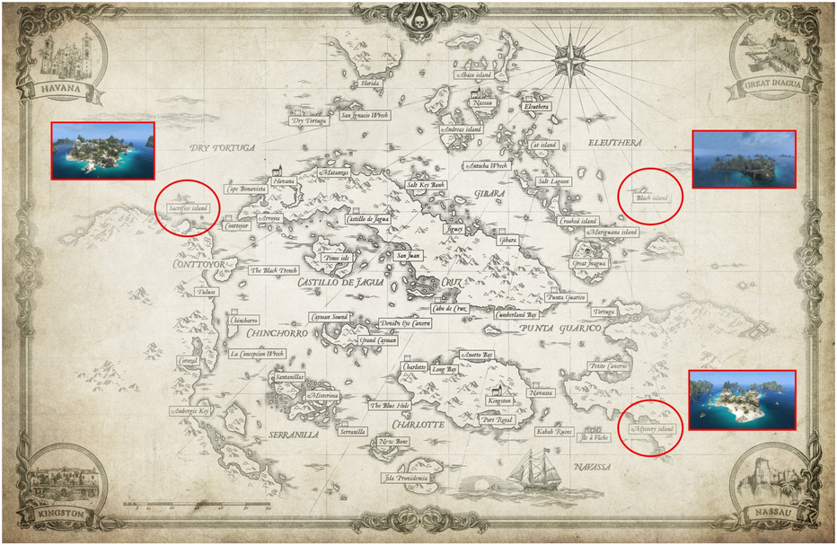 Tout y est presque identique : l’aspect manuscrit de la carte, les ports et les hubs principaux du monde ouvert, les grandes villes comme Havane, Nassau, et Kingston, sans compter les 50 petites îles qu’Edward Kenway pourra amarrer et visiter. Mais en y regardant de plus près, les fans historiques ont remarqué que les îles des packs autrefois payants ou réservés aux éditions spéciales à l'époque seront de retour dans ce remake d'Assassin's Creed Black Flag. Si les extensions narratives seront absentes, notamment Freedom Cry, l'Île des Sacrifices, l’Île Noire et Mystery Island seront finalement incluses dans l'expérience de base. Cela laisse entendre qu'Ubisoft a prévu quelques autres surprises, comme la tenue du Capitaine Morgan.