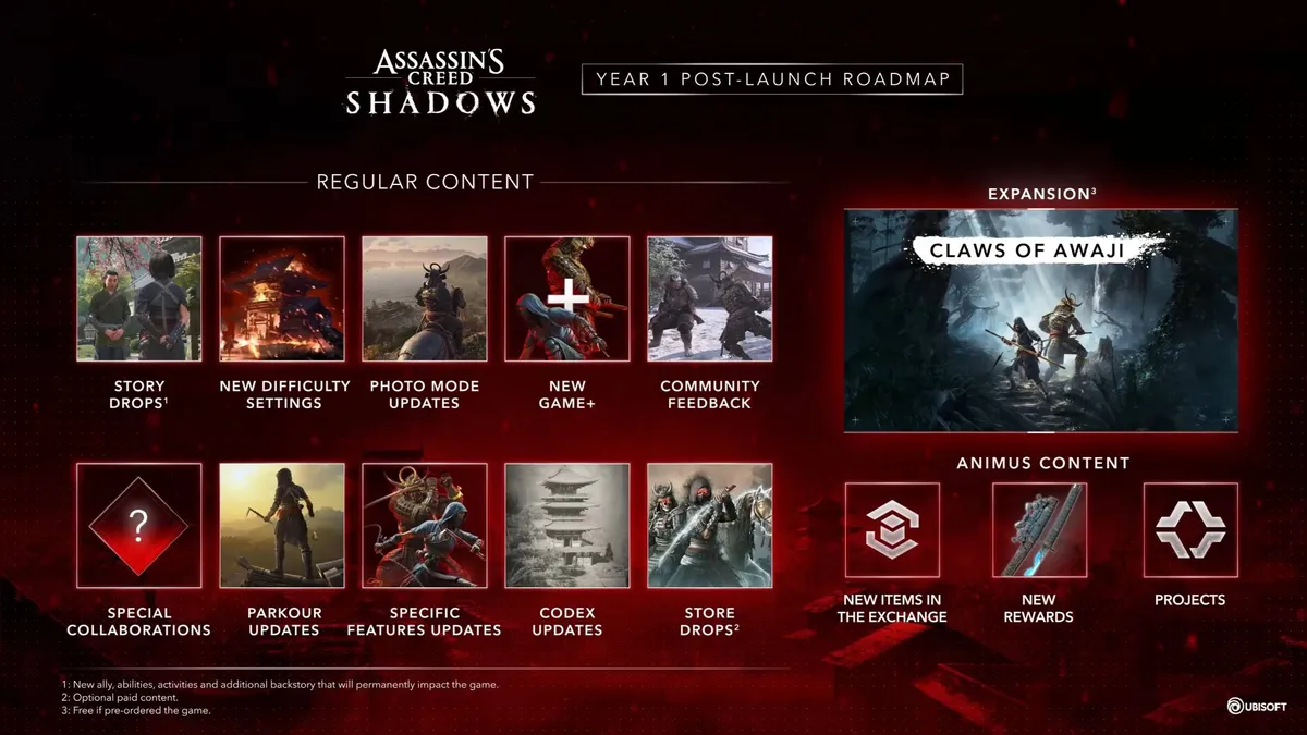 Le point d’orgue de cette première année sera Claws of Awaji, une extension qui poursuivra l’histoire de Naoe et Yasuke après l’épilogue du jeu principal. Elle sera gratuite pour les joueurs ayant précommandé Assassin’s Creed Shadows.