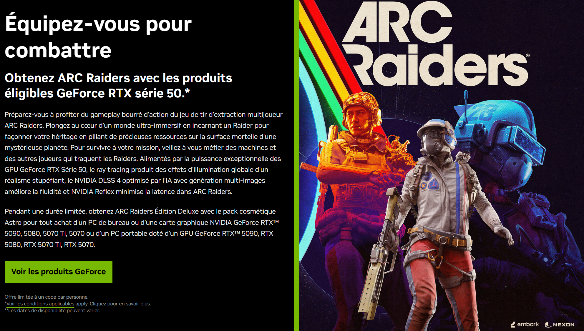 En ce moment d’ailleurs, vous pouvez profiter d’une offre exceptionnelle pour l’achat de cartes graphiques RTX Série 50 éligibles comme la RTX 5060 Dual Series, la ASUS GeForce RTX™ 5080 Noctua OC Edition et la ROG Astral GeForce RTX™ 5080 OC Edition White, toutes testées ici en condition réelle sur Battlefield 6. Grâce au bundle RTX, Nvidia vous offre le jeu ARC Raiders d’Embark Studio (The Finals) pour l’achat d’une carte graphique RTX Série 50, ou une variété de PC gaming fixes et portables déjà tout équipés.