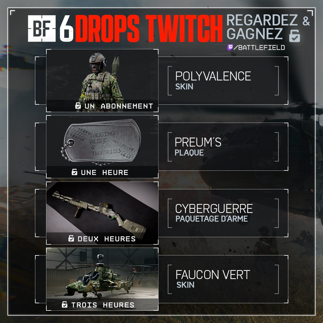 Pour remercier les fans présents dès les premiers jours de Battlefield 6, EA et DICE ont mis en place une campagne spéciale de Twitch Drops. Le principe est simple : il suffit de lier son compte EA à son compte Twitch, puis de regarder des streams de Battlefield 6 avec la mention “Drops activés”. Vous pouvez suivre n’importe quel créateur, que ce soit un streamer populaire ou un joueur occasionnel. Chaque heure passée sur un stream permet de débloquer une nouvelle récompense. Pas besoin de jouer, pas besoin de payer : il suffit de regarder. C’est une méthode efficace pour découvrir le jeu tout en gagnant du contenu gratuit exclusif.