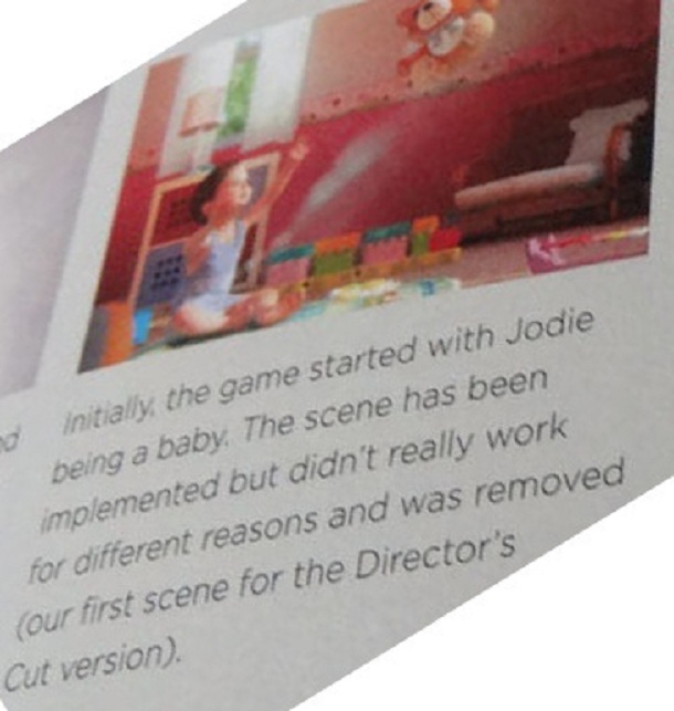 Au départ, le jeu devait commencer avec Jodie bébé. La scène a été implémentée mais ça n'a pas vraiment fonctionné pour différentes raisons et ça a été retiré. (notre première scène pour la version Director's Cut).