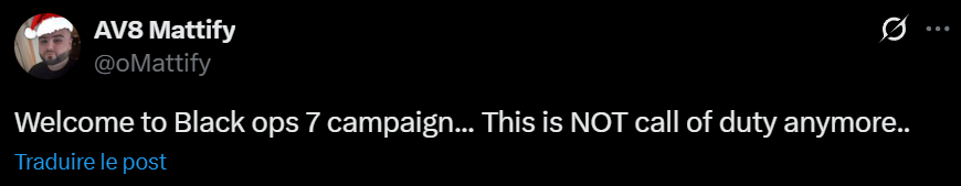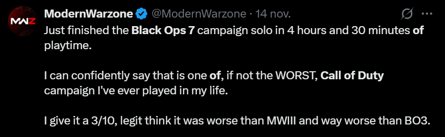Resultat, le ton monte chez les fans qui se font entendre sur les réseaux sociaux. « Un des pires Call of Duty jamais sortis ! » peut-on notamment lire de la part d'un joueur qui cumule pourtant plus de 800 h sur Call of Duty sur Steam. « Ce n'est pas un Call of Duty » explique un utilisateur X en parlant de la campagne, tandis qu'un autre, très connu de la communauté affirme qu'il s'agit certainement là d'une des pires campagnes de la licence. Les retour concernant le multijoueur ne sont pas plus reluisant malheureusement, beaucoup se plaignant encore du SBMM ou encore du gameplay chaotique et des bonus de série qui cassent le jeu.