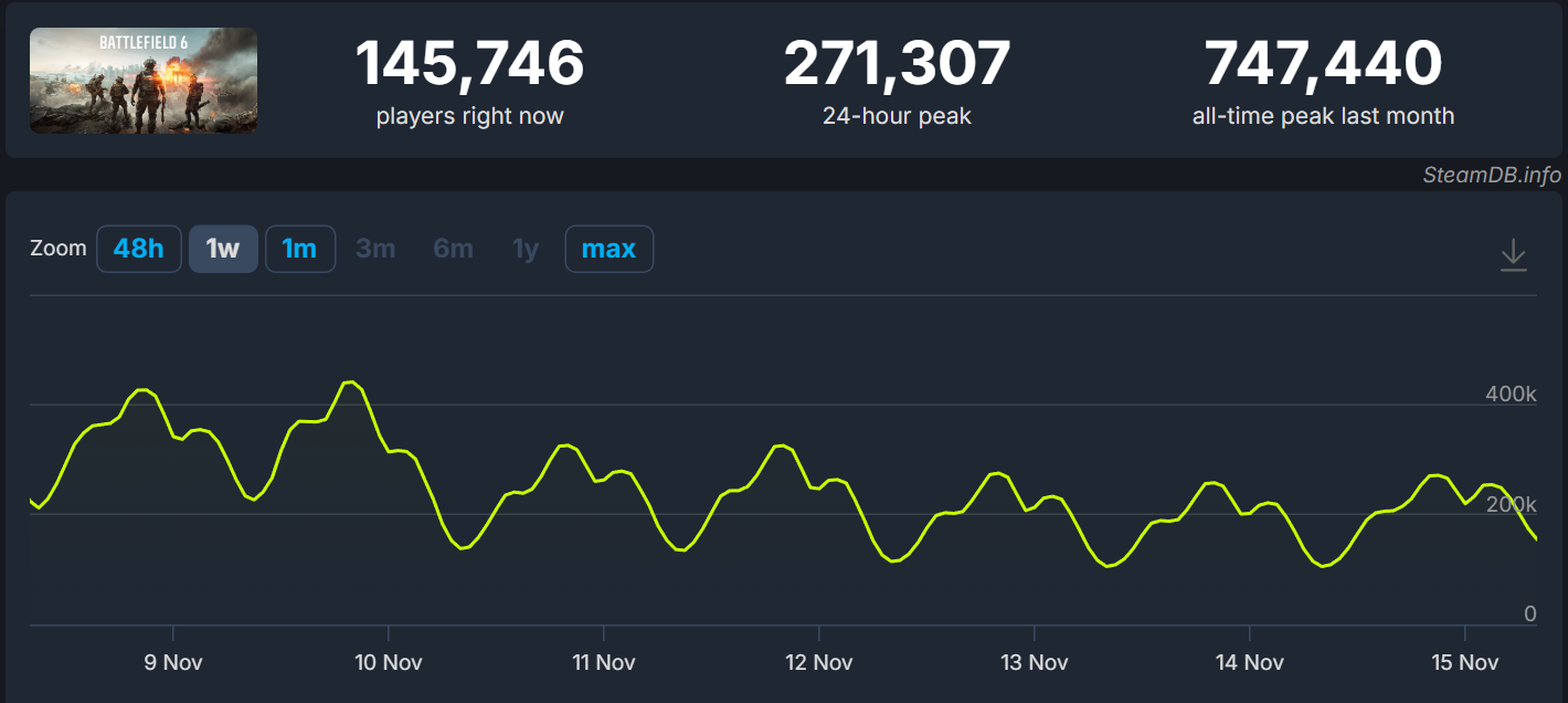 Pour prendre la température de la tendance, il suffit de jeter un œil sur Steam, sur lequel le jeu peine clairement à convaincre. Cela ne prend évidemment pas en compte les chiffres des autres plateformes, notamment le Game Pass où le jeu a été rendu disponible dès sa sortie, mais la comparaison avec les titres précédents de la licence ne sont pas plus glorieux. Les chiffres Steam ne sont clairement pas impressionnants puisque la sortie de Black Ops 7 n'a même pas bousculé les habitudes, on est même en dessous de l'affluence captée au mois d'octobre avec un pic à moins de 90 000 joueurs. À noter que cela capte l'intégralité des joueurs sur l'application Call of Duty et donc aussi ceux qui jouent à Warzone et autres.