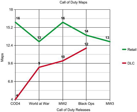 Ce qui l'est moins, c'est l'évidente tendance de la rentabilisation. Ainsi le site Revolt Tech propose un graphique présentant le nombre de Maps incluses dans le jeu... par rapport au nombre de Maps commercialisées par la suite en DLC. Et le constat est flagrant :