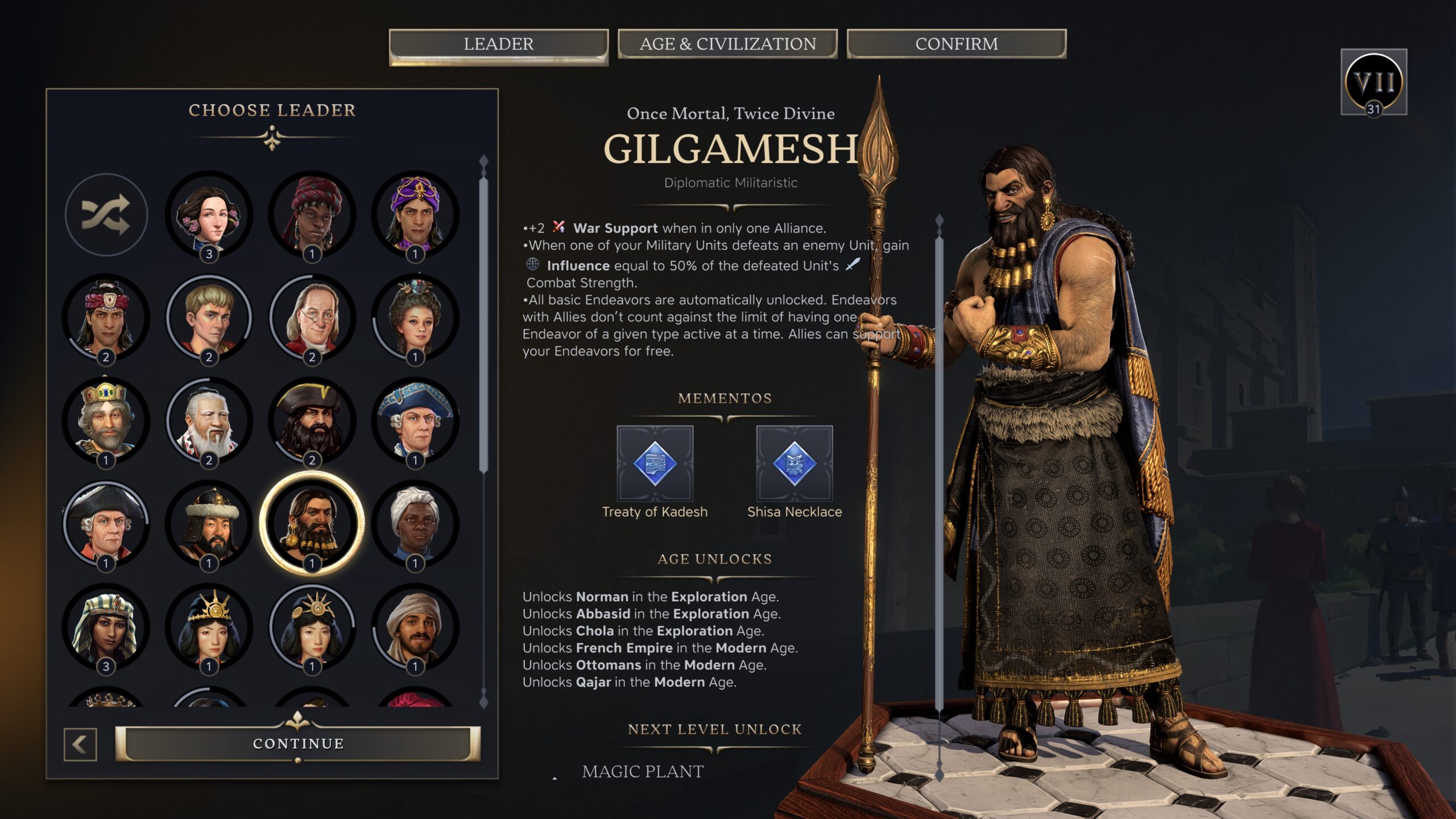 Présentée de façon très expansive sur le blog officiel du jeu, ce patch ajoute plusieurs fonctionnalités attendues qui devraient ravir les joueurs. Déjà, c'est un personnage bien connu qui fait son grand retour : Gilgamesh, roi d'Uruk, est désormais jouable dans Civilization 7. Dirigeant résolument axé autour des combats, il se spécialise dans les aspects diplomatiques et militaires et peut gagner de la force en éliminant des unités ennemies. Il a aussi tout intérêt à fonder des alliances pour consolider ses capacités.
