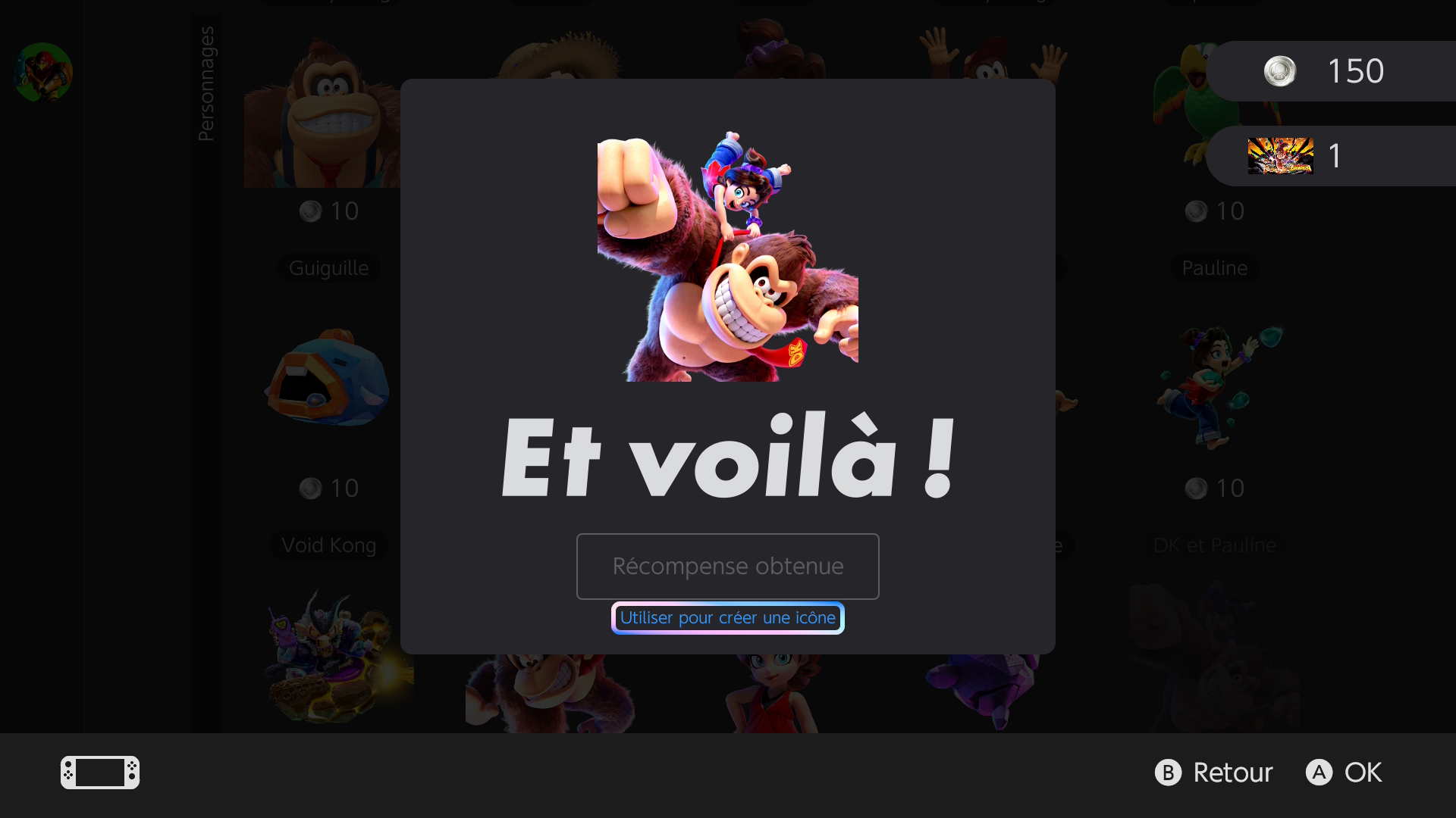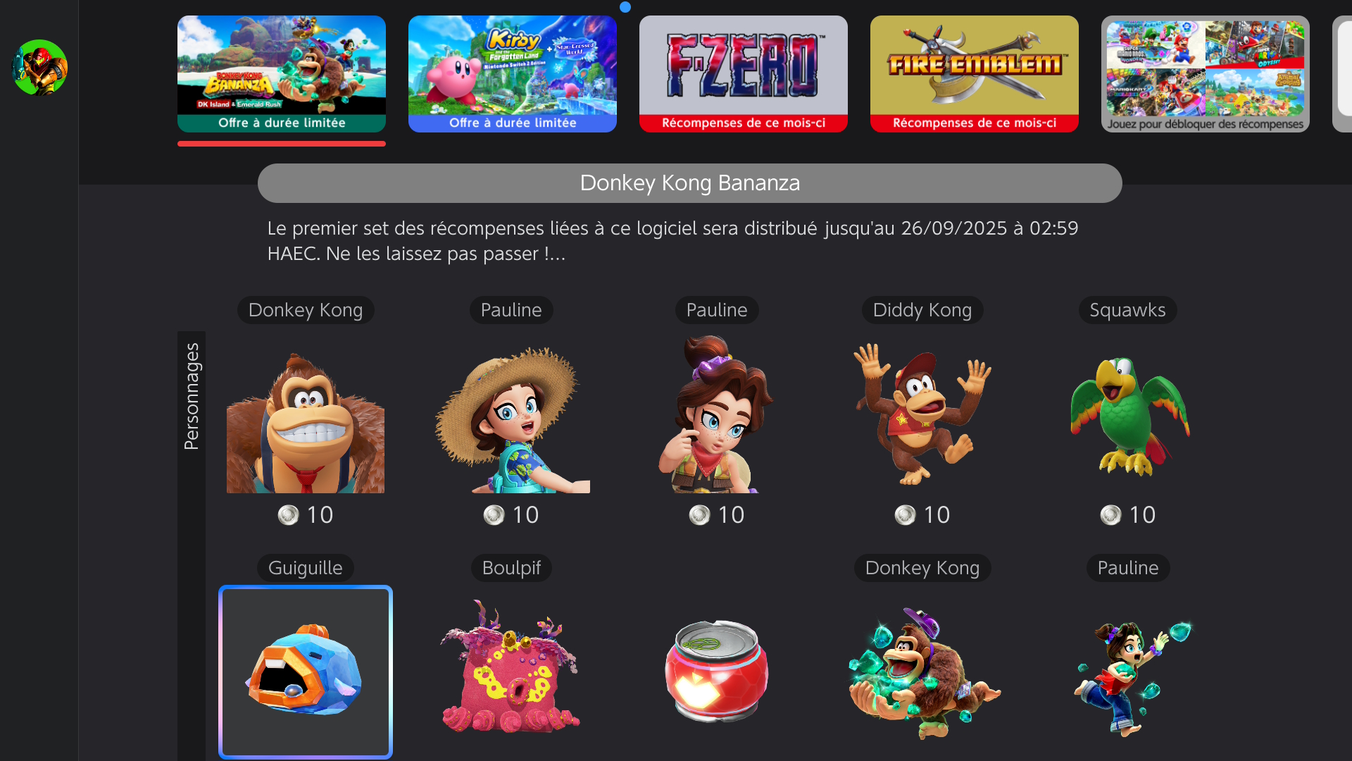 La première vague de cadeaux numériques est actuellement disponible et ce jusqu’au 25 septembre. D’autres vagues sont également prévues avec à chaque fois de nouveaux objets numériques à collectionner pour personnaliser votre profil Nintendo. Les icônes de personnages coûteront 10 pièces platine et représenteront tous les héros de l’univers DK comme Donkey Kong, Pauline, le rhinocéros ou encore Diddy Kong. Les cadres et arrière-plans quant à eux seront aussi dans le thème et coûteront 5 pièces platine à l’unité.