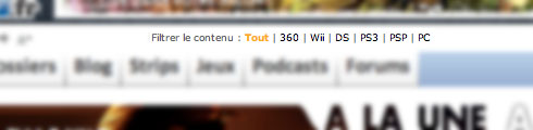 - Juste à droite du champ de recherche, les fonctions qui concernent tout le site, et surtout les filtres. Il n'y a que la 360 et la DS qui vous intéressent ? Cliquez sur l'un, puis sur l'autre, pour n'avoir que ce qui les concerne. Il vous suffit de recliquer sur un des filtres pour les désactiver. Attention les amis, ça trie presque tout partout, si d'aventure quelque chose vous paraissait curieux ("purée, mais ils ne parlent que de la PS3 sur Gameblog ou quoi ?"), c'est sans doute parce que vous avez oublié un filtre...