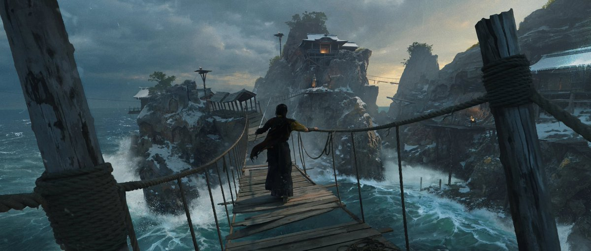 Le premier concept art de Ghost of Yotei nous transporte directement dans l’ambiance. On y voit un personnage avançant lentement sur un pont suspendu au-dessus d'une mer déchaînée.