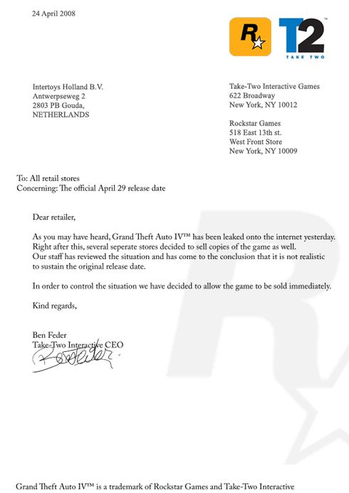 Pour contrer les versions pirates déjà sur l'internet du Web moderne, et prendre les devants sur les boutiques américaines qui ont déjà commencé à vendre GTA IV, l'éditeur Take 2 (la branche des Pays-Bas sur cette lettre épistolaire de mon ami Dino) aurait décidé d'un commun accord avec lui-même, d'avancer la date de lancement du jeu, prévue le 29 avril, à... tout de suite ! Evidemment, il n'en fallu pas plus, à la vue de cette lettre soi-disant officielle, pour mettre le monde vidéoludiconumérique en émoi. Dommage pour vous, petits fouilles-merdes, mais cette lettre... est fausse. Et c'est Rockstar qui le dit. Allez, plus que quatre jours ! La lettre en question, ci-dessous :