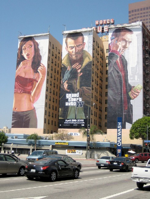 Face à vous, trois gigantesques buildings à l'étrange particularité : ils sont toujours peints aux couleurs d'une marque ou de vedettes très hollywoodiennes. Sauf que là, eh bien l'ambiance se veut GTA IV ! Pour ceux que ça intéresse, ou ceux qui ne sont pas encore saoulés par le raz-de-marée GTA, voici aussi une adresse où vous pourrez trouver certains des plus beaux/gros affichages GTA IV à New York, Los Angeles, Milan, Toronto et... Bethune ! Non, je ne déconne pas. Bethune. Je n'aurai qu'un mot à dire : fantastique...