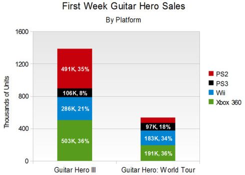 Je sais, de sources proches du dossier que les petits gars et les petites nénettes d'Activision se devaient de faire encore mieux, avec Guitar Hero : World Tour, que Guitar Hero III : Legends of Rock, sorti en novembre 2007. Pourtant, si l'on en croit ce graphique réalisé par le site Gamasutra (qui en fait, l'a repompé sur Gamespot) on constate, que sur chaque machine sur laquelle je jeu est vendue, les scores avec GH : World Tour, sont bien plus faibles que sur GH III, sur la même période de vente, l'an passé aux USA d'Amérique. L'an dernier, justement, c'est la PS2 et la Xbox 360 qui tenaient le haut du pavé, alors que cette année, c'est sur la Xbox 360 ET la Wii que le jeu GHWT s'est le plus vendu. La PS3 est loin derrière, alors que la PS2 est encore plus loin. Au global, les ventes atteignent péniblement" (façon de parler) les 534.000 exemplaires écoulés (67,3 millions de dollars), sur la première semaine de vente, alors que GH III dépassaient déjà le million, sur la même période, avec précisément 1,39 millions d'exemplaires écoulés (115 millions de dollars), toutes machines confondues ! C'est dingue, hein ? L'Europe sauvera-t-ielle Acti ? Réponse, dès le 21 novembre, date de sortie du titre chez nous.