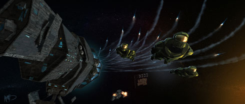 Si on en croit Latino Review, Stuart Beattie (Collateral, Pirates des Caraïbes et tout récemment le premier script du film Gears of War, décidément) n'a pas lâché l'affaire, et s'est fendu d'un script complètement nouveau, basé sur la nouvelle "Halo : Fall of Reach" d'Eric Nylund, laquelle décrit des événements précédant Halo : Combat Evolved. On y découvre l'origine des super soldats Spartan II et du Master Chief. Le projet est suffisamment sérieux, paraît-il, pour avoir mobilisé la participation de l'artiste conceptuel Kasra Farahani (Wolf Man, Hancock, Spider-man 3) qui a produit différentes images de scènes du film, dont celle-ci :