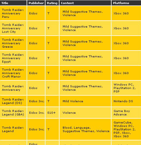Ms. Croft boudant Microsoft ? Pas forcément. Si pour l'instant, Lara Croft Tomb Raider Anniversary n'est officiellement prévu que sur PlayStation 2, PC, PSP et Wii, les listings de l'ESRB, encore eux, font apparaître le remake... 5 fois. Chaque apparition correspond semble-t-il à un niveau de Tomb Raider Anniversary, avec le sous-titre correspondant, ce qui semble indiquer qu'Eidos envisage de sortir le titre par épisode sur le Xbox Live Arcade. En l'absence d'une quelconque confirmation officielle, on reste bien entendu dans le domaine de la rumeur, sans en savoir plus sur une quelconque date ou un prix. Comme on le murmure dans les milieux autorisés en mettant tout au conditionnel de rigueur : Wait and See.