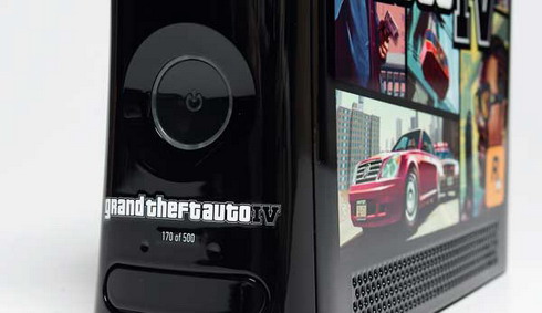En ce moment la mode est aux consoles collector ! Ainsi quelques jours à peine après avoir découvert la PlayStation 3 Metal Gear Solid 4, voici venu le temps non pas des rires et des chants, mais plutôt de la Xbox 360 GTA IV ! La voici, sous vos yeux, noire-supra-laquée. Le tout souligné par une grosse compo visuelle sur la tranche histoire de passer incognito.
