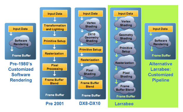 Larrabee, c'est le petit nom du projet de "puces 3D" de chez Intel. Un petit nom tout mignon pour un gros projet qui va donner un gros coup de savate dans les fesses rondes et potelées de Nvidia & co. Intel a clairement décidé de venir bouffer leur gâteau avant que ces constructeurs de cartes 3D ne viennent picorer dans son assiette. Le géant du microprocesseur n'est pas très fan de ces petits gars qui viennent le titiller avec leurs solutions d'accélération qui commencent à vouloir s'occuper d'autre chose que de l'affichage. Et manque de chance pour AMD/ATI et Nvidia, Intel est particulièrement en forme en ce moment. La future génération de processeurs, appelés Core i7 (septième génération de processeur) s'annonce redoutable de performances, tout comme Larrabee, qui semble gavé d'idées suffisamment révolutionnaires pour que même les blasées l'attendent avec impatience.