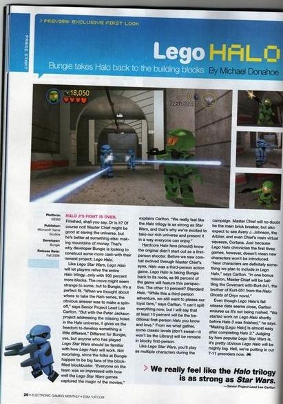 Enfin, tout ça pour dire que dans cette actu fofolle, j'avais envie de vous parler de LEGO Halo. Si, si. Après les LEGO Stars Wars, les LEGO Batman, les LEGO Indiana (Docteuuuuuuuuur) Jones, les LEGO se tapent Martine, etc., eh bien les petits bonshommes semblent intéressés par l'univers de Halo. C'est en tout cas ce que le magasine EGM aurait envie de nous faire croire. Ils y mettent toute leur envie d'avoir envie, avec une belle page dédiée au sujet. Le hic, c'est que l'article est publié dans leur édition daté du mois d'avril... Pour la crédibilité on a déjà fait mieux ! Mais allez, qui sait, parce que : Abdel Yves Akim Fly...