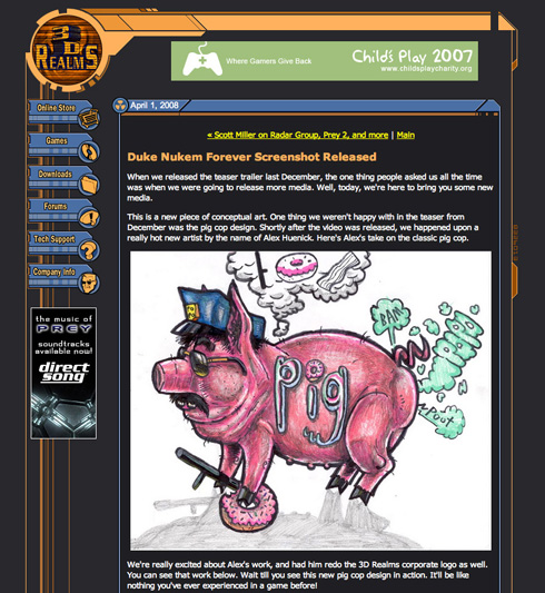 Du côté de 3D Realms, on a les cojones de faire un poisson d'avril sur Duke Nukem Forever, avec un soit disant re-design du Flic Cochon et du logo 3D Realms par un enfant de 5 ans :