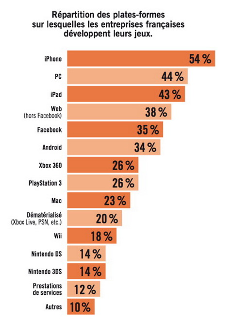 Mais le plus important arrive ensuite. Rendez-vous compte, seulement un quart (26%) des entreprises françaises de jeu vidéo travaillent sur consoles, et on ne parle ici que de PS3 et Xbox360. Alors que les consoles portable sont elles loin derrières avec seulement 14%. Certains iront crier au scandale, mais en fait quand on y réfléchit bien, c'est tout à fait normal. Car, comme je vous en parlais lors de l'annonce du label "Le Game" (voir : "Le Game" : le jeu vidéo made in France), l'industrie française du jeu vidéo est composée en grande majorité (environ 75%) de petites ou moyennes entreprises. Alors qui dit petites entreprises dit petits moyens, du coup il est logique que ces développeurs se dirigent vers un marché où les coûts de production seront moindres et où il est facile de développer comme iOS ou Facebook, et le web en général.