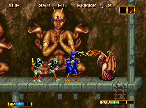 Le jeune Elta n'aura jamais l'occasion de savoir si c'est parce qu'il a une pauvre tronche de geek boutonneux ou parce que son misérable cosplay de Schtroumpf du Ku Klux Klan s'avère foireux, qu'il se fera tabasser à la chaîne par des hordes de rôlistes costumés fans de l'univers de Donjons et Dragons . En tous cas, il en prendra pour un dollar en se faisant éclater la gueule violemment sans sommation et à répétition, tombant en syncope tous les 10 mètres et se relevant plus tard pour se reprendre une nouvelle rasade de coups 10 mètres plus loin, again and again ... En décidant de visiter les catacombes en ce jour béni du 31 octobre, le jeune homme pensait au départ entreprendre une excursion conviviale façon Bobo Parigot, loin de se douter qu'elle allait prendre une toute autre tournure digne de l'Extrême-Droite punitive. Totalement découragé et fataliste, Elta songera même à se laisser mourir sous les coups intenses et nourris de ses agresseurs. Mais c'était sans compter sur l'ironie du sort qui le maintenait en vie et le faisait à chaque fois se relever, le soumettant inlassablement à une nouvelle séance de volées de bois vert dans la tronche, dans un lent et douloureux supplice ritualisé dont la multiplication des faits semblait sans fin. Après avoir goûté à la défenestration, le molestage de groupes, les coups de bâtons, les attaques à l'arme blanche, les puissants coups de pieds dans le cul... ...Elta réussira toutefois à se sortir de cet enfer sensoriel et anti-cognitifs au prix de crédits infinis. Bref, Magician Lord illustre avec brio la Loi de Murphy sur l'emmerdement maximum qui stipule que ce qui peut mal tourner, ne peut qu'empirer de façon exponentielle. Enfin je crois.