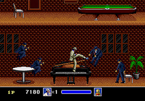 Dans Michael Jackson's Moonwalker, Sega aborde la face obscure du célébrissime artiste over-décédé cette année en nous dévoilant de façon vidéoludique un aspect assez sombre de sa personnalité : son exigence, qui frôlait la maniaquerie. En effet, le pitch est simple et sans fioriture : la star internationale débarque dans un bar tout miteux pour boire un coup avant de se rendre compte que le lieu n'est pas digne de son standing. Complètement offusqué par l'accoutrement pitoyable des divers serveurs pourtant tous sapés chez Gucci, Michael va piquer une colère "grise" et décider de nous livrer un showtime anxiogène d'anthologie. Ainsi, plongé dans une profonde crise mégalomane incontrôlable de folie des grandeurs, il va se mettre à danser en plein restaurant pour attirer toute l'attention sur lui, tout en distribuant des coups de tatanes roboratifs dans le fondement de l'intégralité de la populace se trouvant sur sa trajectoire. Car personne n'a le droit de gêner le King of Pop en action, surtout lorsqu'il se déhanche sur sa propre prose musicale...