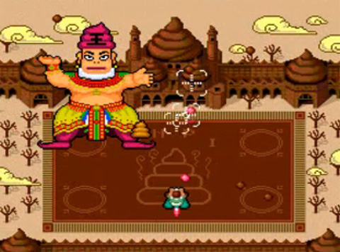Media Ring, une firme nippone spécialisée dans les anneaux, nous démoule avec Toilet Kids l'unique cake vidéoludique scatologique de l'histoire du jivé. Il faut replacer ce titre dans son contexte politique et social : nous sommes en 1992 et l'empereur du Japon décide de se rendre en Chine pour la première fois. Pour fêter cela, l'éditeur va nous déféquer un shoot odorant pas banal pour marquer symboliquement cet événement, en nous rappelant par cette belle allégorie que, que l'on soit chinois ou japonais, au final, tous les matins nous devons tous satisfaire un Droit Naturel rousseauïste qui nous met sur un pied d'égalité : celui de couler un bronze bien odorant. Pour en revenir au jeu, sa trame se révèle digne d'une intrigue Lynchéenne au maximum de ses possibilités : un jeune homme s'apprête à annoncer avec fracas l'arrivée du capitaine caca, quand un geyser surréaliste émanant de ses gogues le propulse dans les airs avant de l'aspirer au fin fond de la cuvette. Puis dans une somptueuse diffraction narrative interlope digne du film Lost Highway, il se retrouve subitement aux commandes d'un vaisseau spatial dont l'objectif sera de détruire des fécalum anxiogènes à la chaîne... Great !