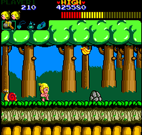 Sega nous offre avec Wonder Boy un crypto-documentaire archéologique pointilleux sur les conditions de vie anxiogènes des premiers hommes durant la Préhistoire. Pour ressituer le jeu dans son contexte politique et social, l'homo rudolfensis vient de mettre au point l'ancêtre de la hachette avec du silex taillé et une branche de bois toute pourrie. Tom-Tom est un jeune garçon d'origine aryenne dont la petite copine s'est faite enlevée par un gredin local. Il partira à la rescousse de sa belle armé de cette trouvaille low-tech, avant de se retrouver rapidement confronté à une problématique de taille : l'extrême dangerosité de se promener pieds nus et quasiment à poil en territoire hostile. En effet, le simple fait de piétiner malencontreusement un escargot, une simple pierre posée au sol ou d'entrer en contact avec d'autres organismes vivants (abeilles, chauve-souris, araignées...) provoquera le décès irrémédiable du bambin. Il faut savoir qu'en ces temps reculés, les vaccins n'existaient malheureusement pas, et qu'il était donc facile de caner stupidement, foudroyé par le tétanos ou une infection virale chosique...
