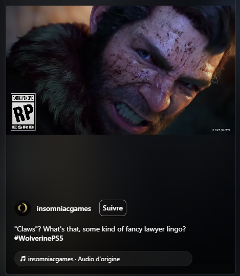Tout est parti d'une courte vidéo publiée sur le compte Instagram du studio américain Insomniac Games. On peut y voir un Logan plutôt énervé qui fait sortir les griffes, le visage couvert de sang. Une vidéo assez banale dans le contexte de communication autour du jeu. Mais l'élément intéressant se trouve dans la description du post. En-dessous d'une image de Marvel's Wolverine, le texte indique : "Des griffes ? C'est quoi ça, une sorte de jargon d'avocat prétentieux ?"