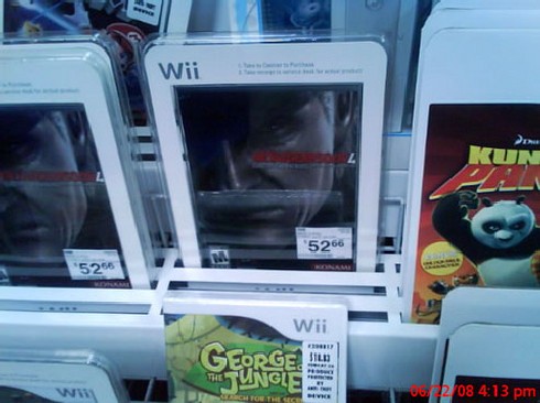 Attention véritable séisme dans le landernau vidéoludique ! Metal Gear Solid 4 : Guns of the La-li-lu-le-lo est disponible sur Wii aux Etats-Unis ! Il a même un prix : 52,66$ ! Autre surprise : il tient sur un seul DVD. Vous ne nous croyez pas ? Eh bien regardez la photo pour en être persuadé... Elle provient du Sams Club de Douglasville, la ville où tout le monde s'appelle Douglas, même les nanas.